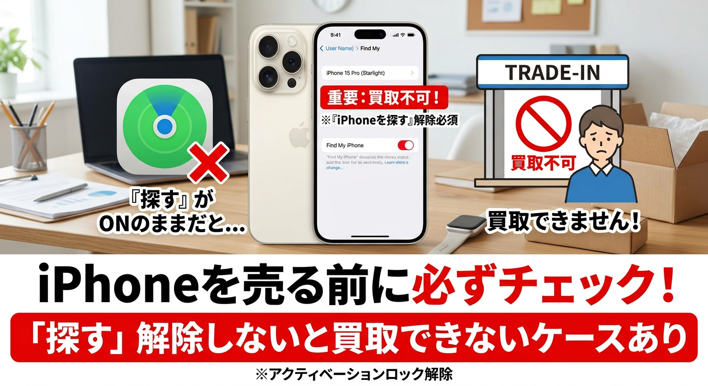 iPhoneを売るときは「探すの解除」と「初期化」が必要です。 特に「探す」がオンのままだとその場で買取できないことがあります。 手順と注意点を簡単にまとめています。